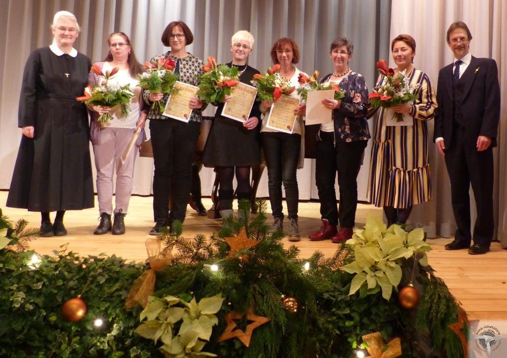 Sechs Mitarbeiter wurden bei der diesjährigen vorweihnachtlichen Feier der Anna-Schwestern für ihre langjährige Zugehörigkeit von Generaloberin Schwester Veronika Mätzler und Verwaltungsleiter Michael Hinderer geehrt.