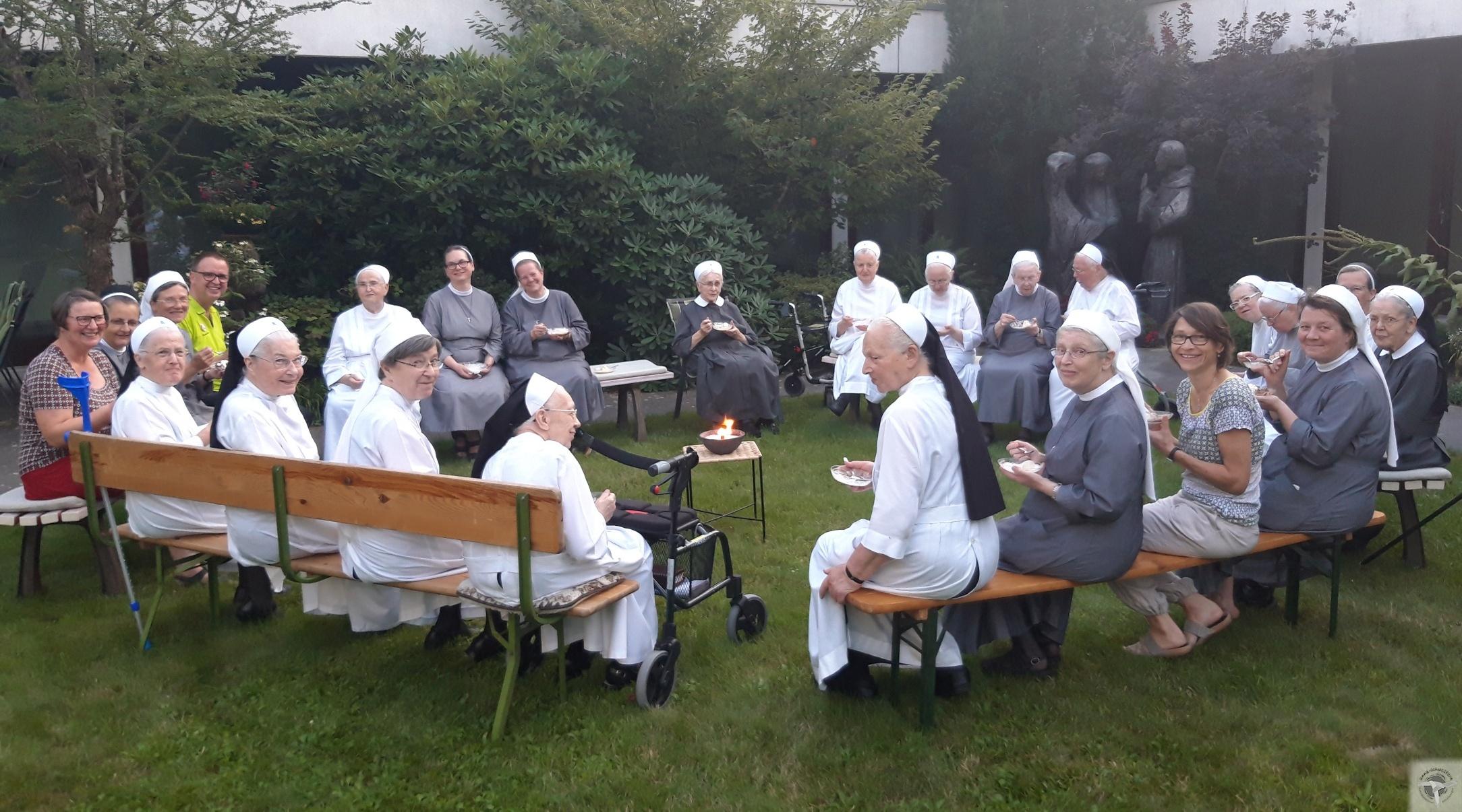 Bei schönem Sommerwetter konnten wir unseren 98. Gründungstag feiern. Nach einem schön gestalteten Vespergebet in unserer Mutterhauskapelle, trafen wir uns dann zum Eis essen im Innenhof. Die Anzahl der Jahre erreichten wir mit unseren Eiskugeln nicht ganz ....