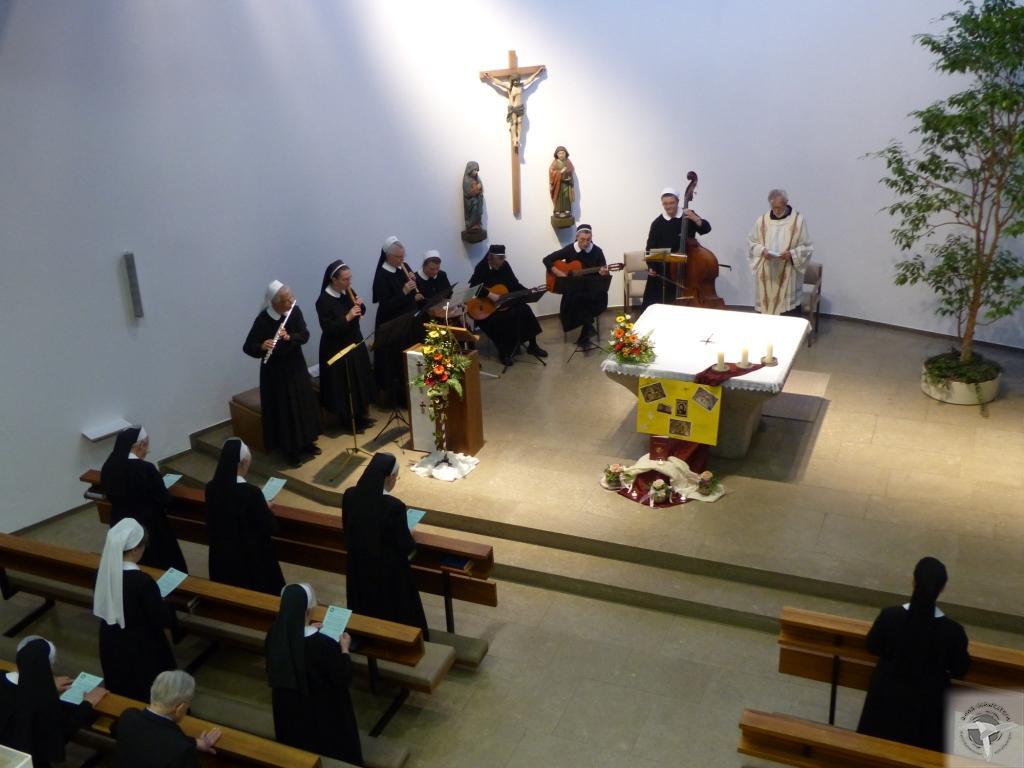 In seiner Festpredigt dankte Kapuzinerpater Norbert Poeschel den Jubilarinnen für ihr Lebenszeugnis im Sendungsauftrag der Franziskanerinnen von Ellwangen und ermutigte sie weiterhin das Feuer in ihren Herzen brennend zu halten, denn „wir tragen Verantwortung für unsere Mitchristen. Wir tragen aber auch vor Gott Verantwortung denen gegenüber, die meinen, nicht glauben zu können. Denken wir daran, dass wir zu ihnen halten müssen, weil doch auch wir gehalten sind von der Liebe und dem Erbarmen Christi!“ Als Hauptzelebrant feierte Prälat Werner Redies die Eucharistie in Konzelebration mit Pfarrer Anton Esswein. Der festliche Gottesdienst wurde musikalisch gestaltet durch Margit Lang (Orgel und Gesang), Monika Willand (Cello), Günter Schleinkofer und Gerhard Martin (beide Violine) sowie die Eheleute Schütz (Orgel und Gesang).